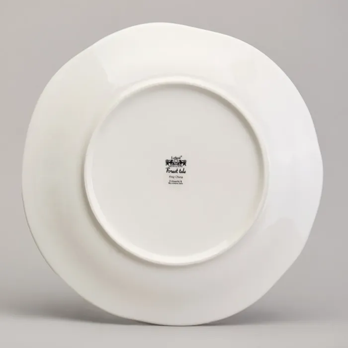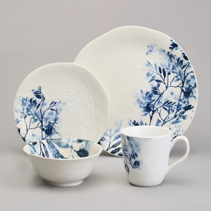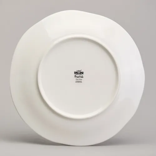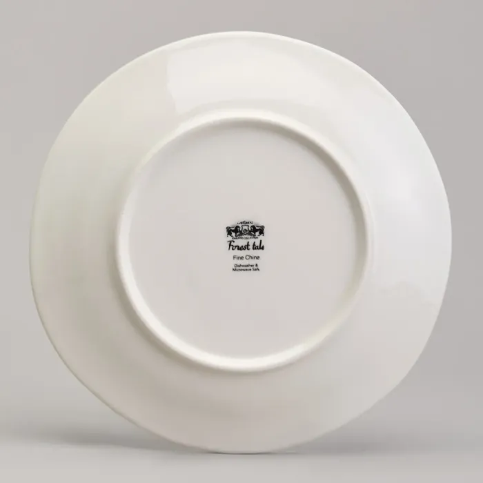 Предметы изготовлены из фарфора, материала, известного своей прочностью и гигиеничностью. Поверхность покрыта глазурью, что облегчает уход. Конструкция включает обеденные и закусочные тарелки, салатники и кружки с удобными ручками.