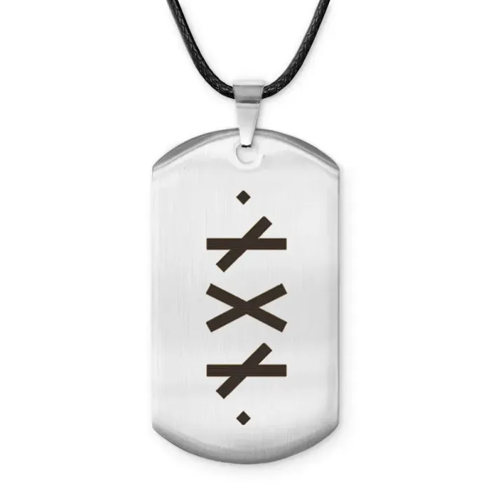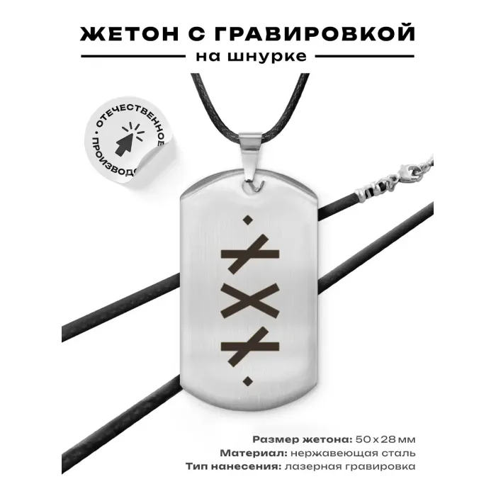 Амулет-жетон из полированной нержавеющей стали с нанесёнными рунами.