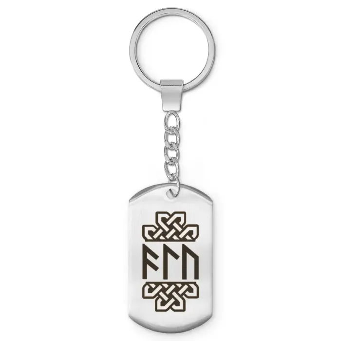 Брелок-жетон из нержавеющей стали с зеркальной полировкой и нанесённой рунической формулой.
