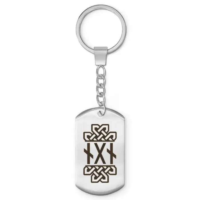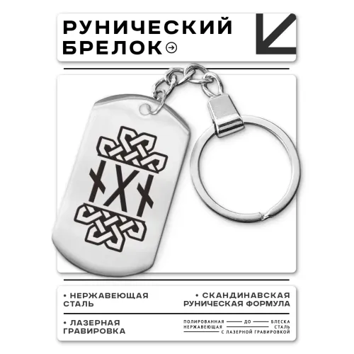 Брелок-жетон из нержавеющей стали с полированной поверхностью и нанесёнными рунами.