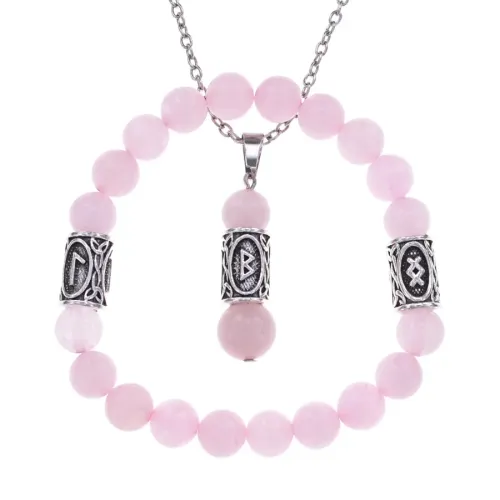 Набор женских украшений из натурального розового кварца и бижутерного сплава с руническими символами.