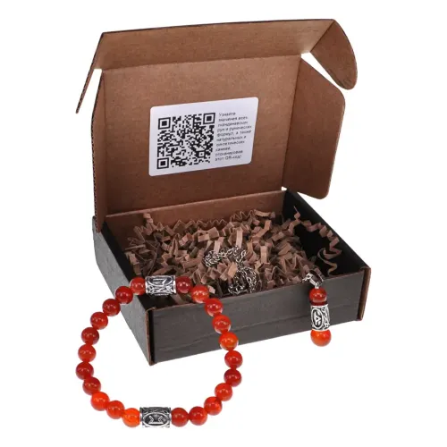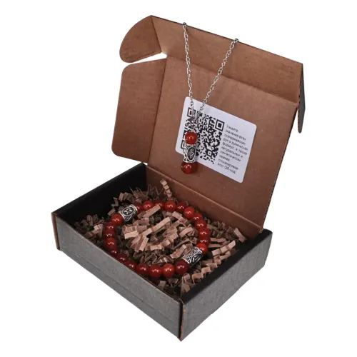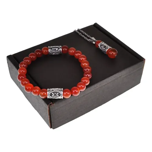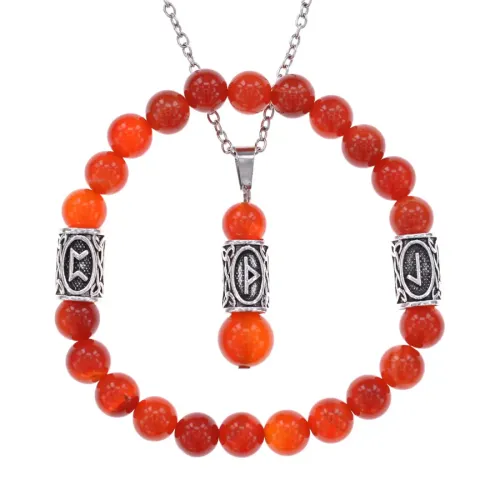 Подарочный набор, состоящий из браслета и кулона, выполнен из натурального сердолика и бижутерного сплава с руническими символами.