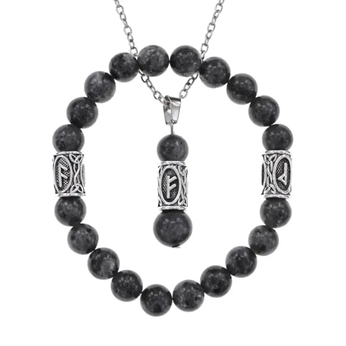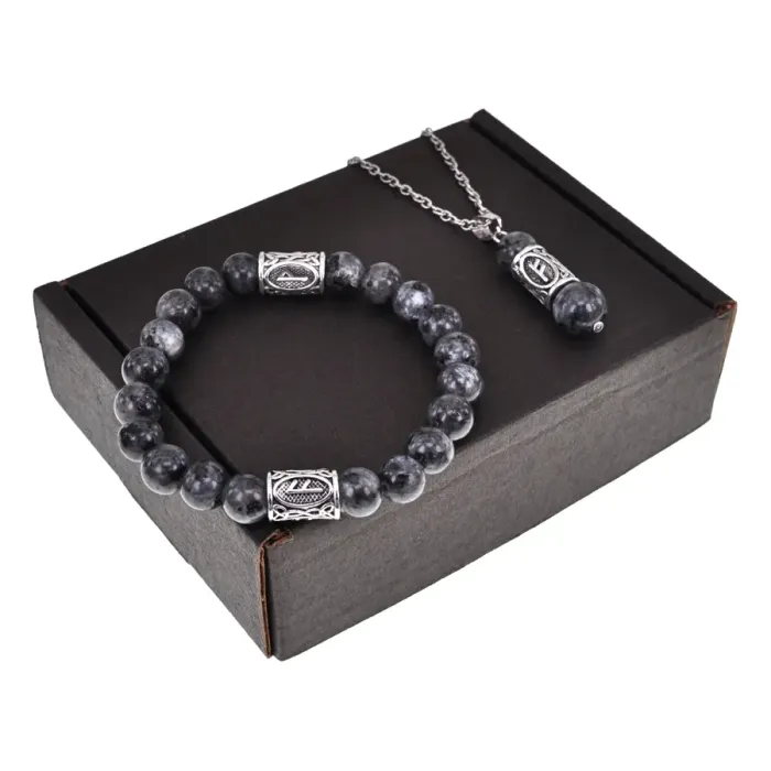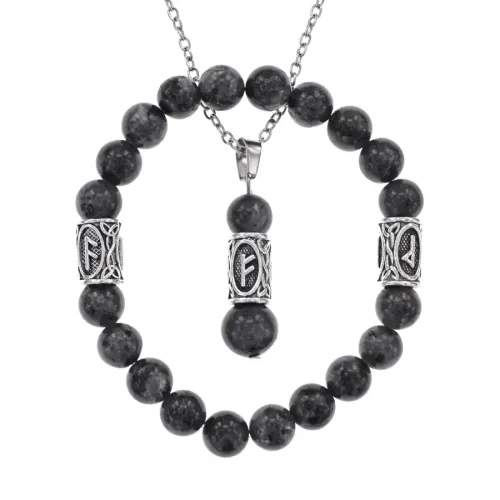 Набор сувенирный, состоящий из браслета и кулона. Материалы: натуральный камень лабрадор и бижутерный сплав. Дизайн включает рунические символы.