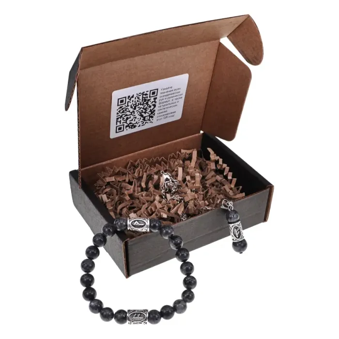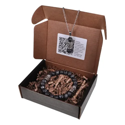 Размеры и комплектация: Браслет: диаметр бусин 8 мм, внутренний диаметр ~5.5 см. Кулон с бусинами 8 и 10 мм. Упаковка: картонная коробка 11.2 x 8.3 x 3 см с крафт-наполнителем.