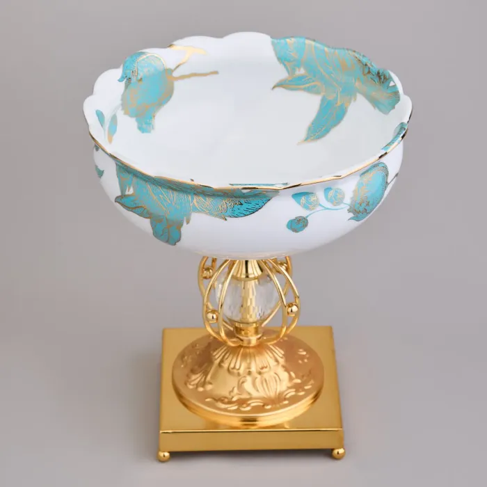 Конструкция фруктовницы сочетает в себе высококачественный фарфор и металлические элементы декора. Особое внимание уделено детализации: каждый элемент продуман до мелочей, что придаёт изделию уникальный художественный замысел. Специальная техника создания трещин усиливает винтажный эффект, добавляя шарм антикварной коллекции.
