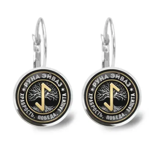 Серьги-сувенир из бижутерного сплава с изображением руны под выпуклой стеклянной линзой.