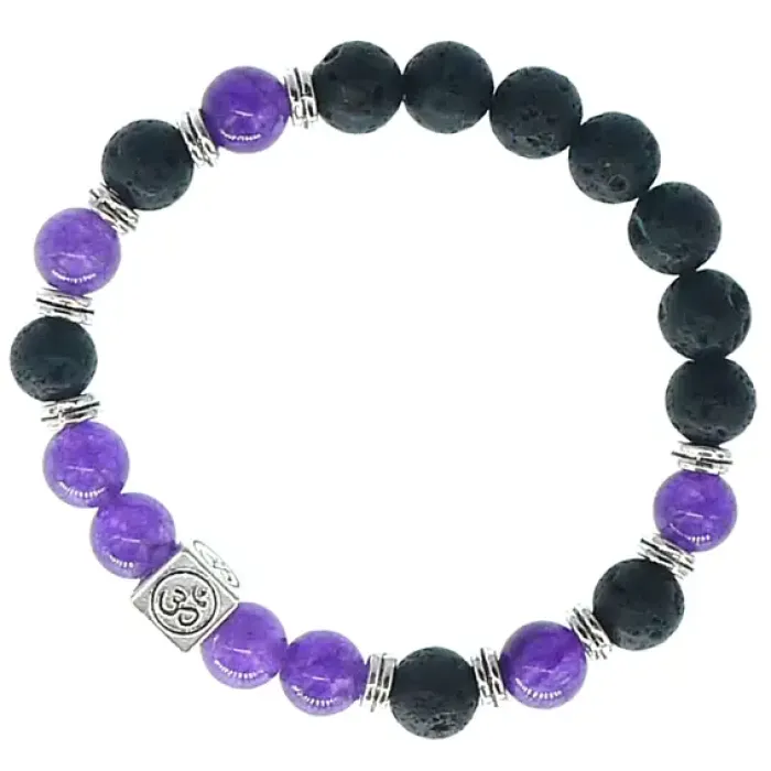 Материал и изготовление: Лавовый камень, кварц, металлическая подвеска с символом Ом.