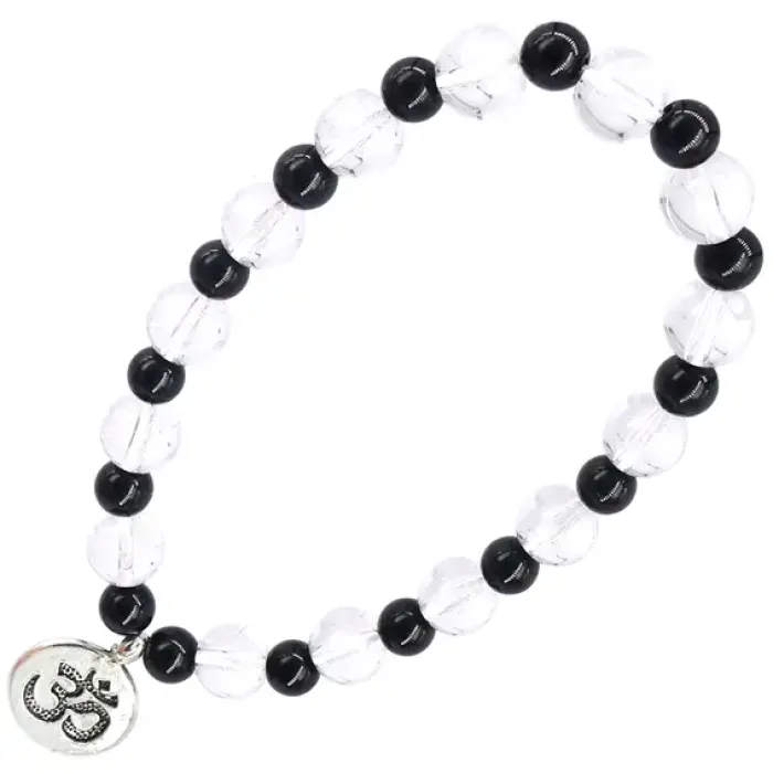 Браслет с подвеской в виде символа «Ом». Изготовлен из натурального горного хрусталя и черного агата.