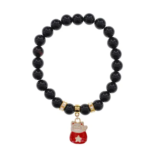 Браслет из натурального черного агата с подвеской в виде кошки Манеки-Неко. Модель с эластичной основой.