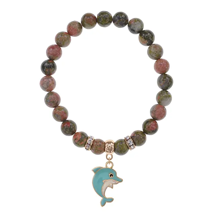 Браслет из натурального унакита с бусинами 8 мм и подвеской в виде дельфина.