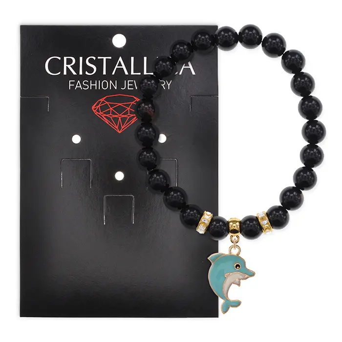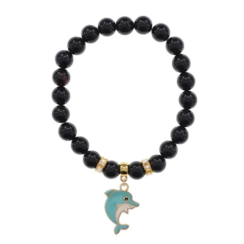 Стрейч-браслет из натурального черного агата с подвеской в виде дельфина и стразами.