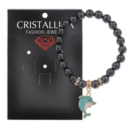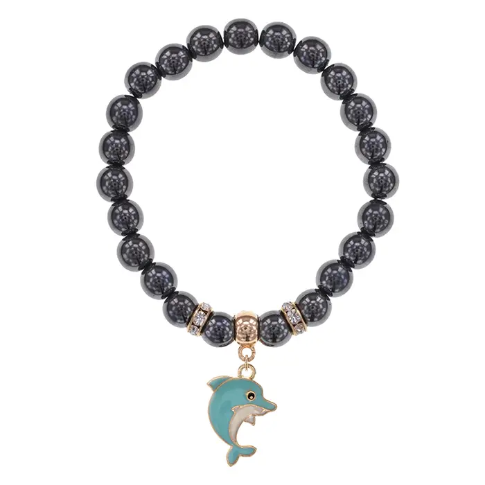 Стрейч-браслет с бусинами из гематита и подвеской в виде дельфина.
