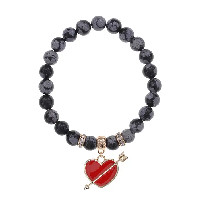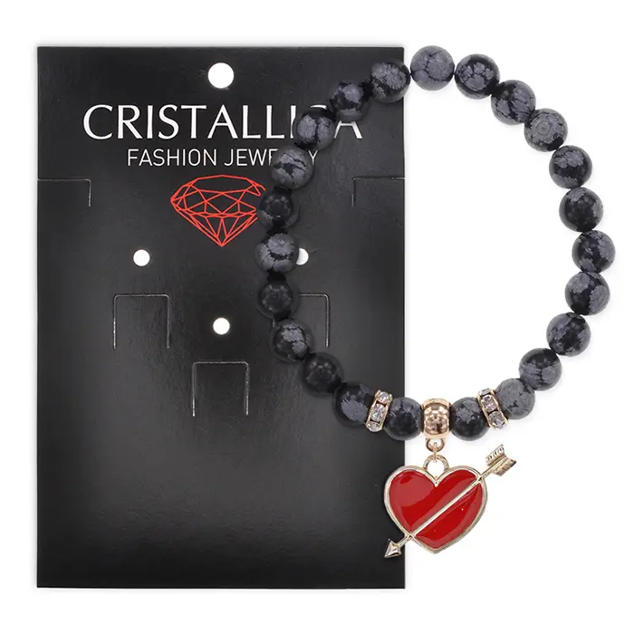 Стрейч-браслет из натурального обсидиана с декоративным элементом в виде сердца со стрелой.