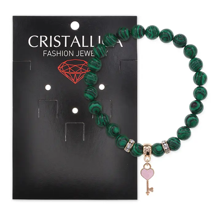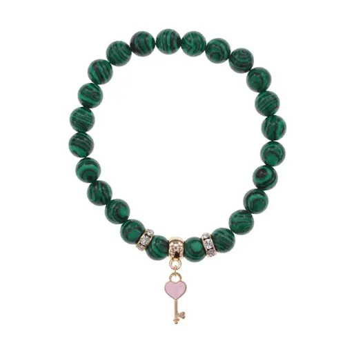 Стрейч-браслет из коллекции Cristallica с подвеской в виде ключа и сердца, изготовленный из синтетического камня малахит.