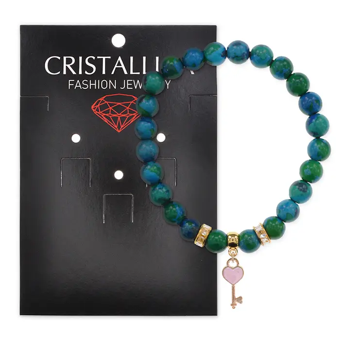 Стрейч-браслет из коллекции Cristallica с бусинами из натурального камня хризоколла и подвеской в виде ключа-сердца.