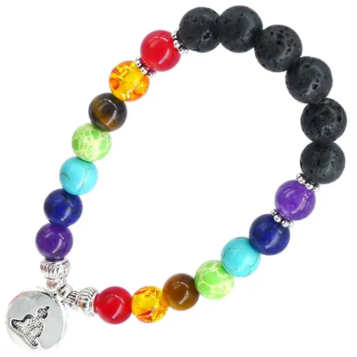 Материал и изготовление: Изготовлен из натуральных камней: лавового камня, сердолика, тигрового глаза, кварца, агата и имитации бирюзы. Подвеска в виде Будды.