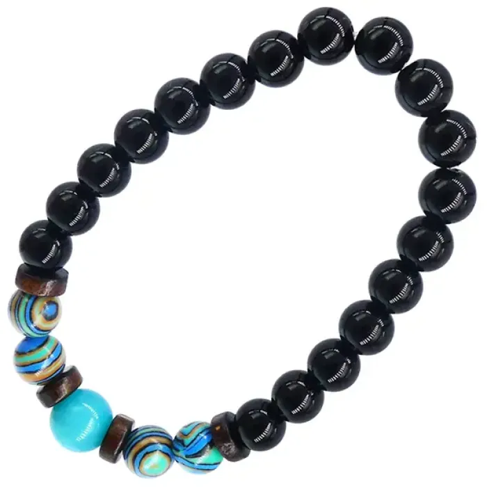 Браслет из натуральных камней голубого и черного агата. Дизайн из бусин диаметром 8 мм.