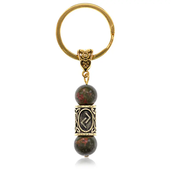 Брелок-амулет из натурального камня унакит и бижутерного сплава с покрытием под золото. Дизайн включает рунический символ Йера.