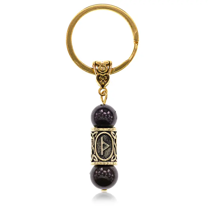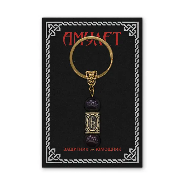 Брелок-амулет из натурального камня гранат и бижутерного сплава с руническим символом Турисаз.