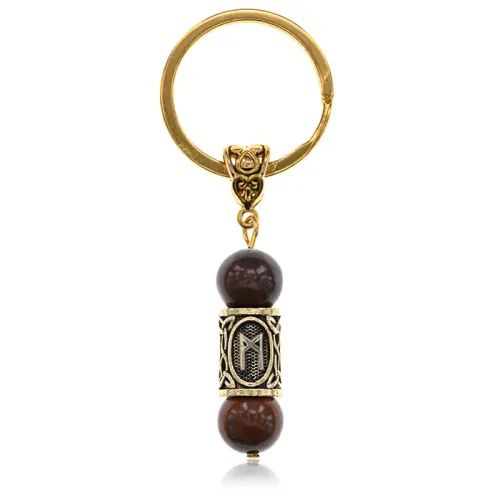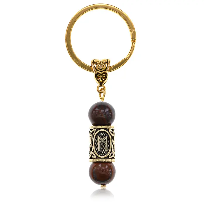 Брелок-амулет из натурального камня тигровый глаз и бижутерного сплава с руническим символом Манназ.