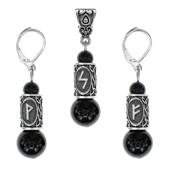Комплект сувенирных украшений из натурального камня и бижутерного сплава с руническим дизайном.