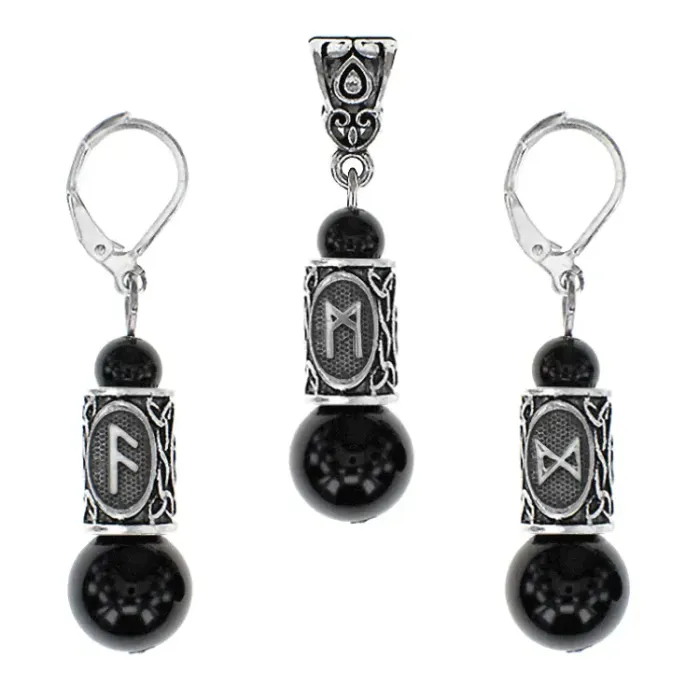 Размеры и комплектация: Диаметр бусин 6 и 10 мм. В комплекте серьги и кулон. Упаковка: полипропиленовый пакет с подвесом, коробка, этикетка с описанием рун.