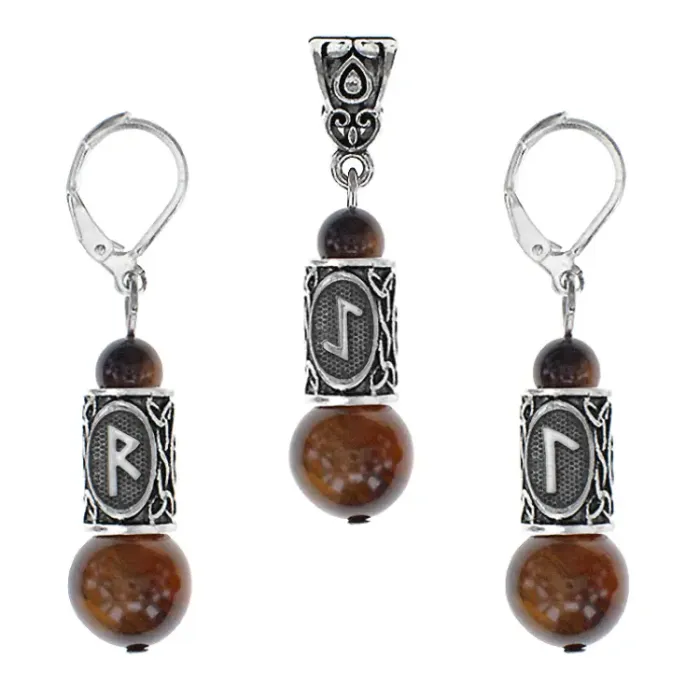 Комплект украшений «Руны Дороги» включает серьги и кулон из натурального камня Тигровый глаз.