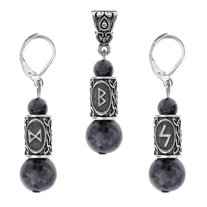 Размеры и комплектация: Комплект в коробке. Включает серьги, кулон на шнурке с застёжкой, полипропиленовый пакет с подвесом, этикетку с описанием. Значения рун доступны по QR-коду.