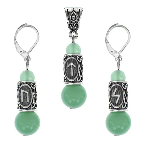 Комплект украшений из натурального нефрита и бижутерного сплава с элементами скандинавских рун.