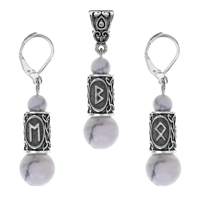 Комплект украшений из натурального камня кахолонг с элементами из бижутерного сплава и символикой скандинавских рун.