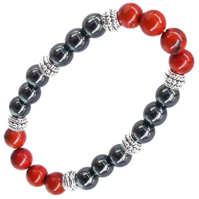 Браслет из натуральных камней яшмы и гематита с диаметром бусин 8 мм.