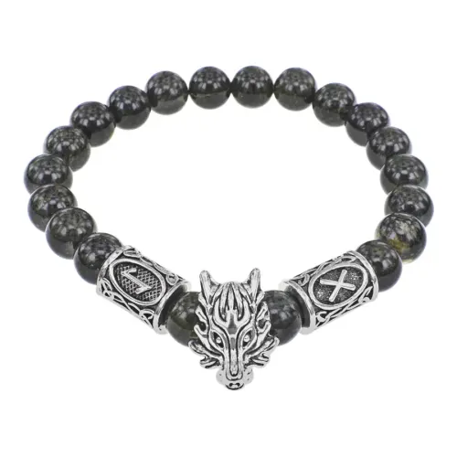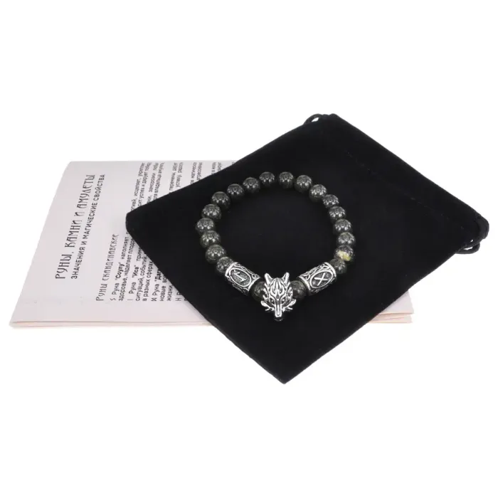 Материал и изготовление: Натуральный камень змеевик, бусины диаметром 8 мм. Амулет Волк и руны (Эйваз, Гебо) выполнены из бижутерного сплава с покрытием под серебро.