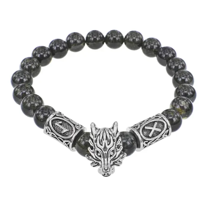 Рунический стрейч-браслет из натурального камня змеевик с амулетом и рунами из бижутерного сплава.