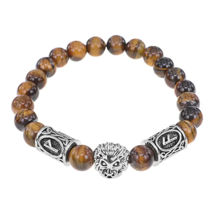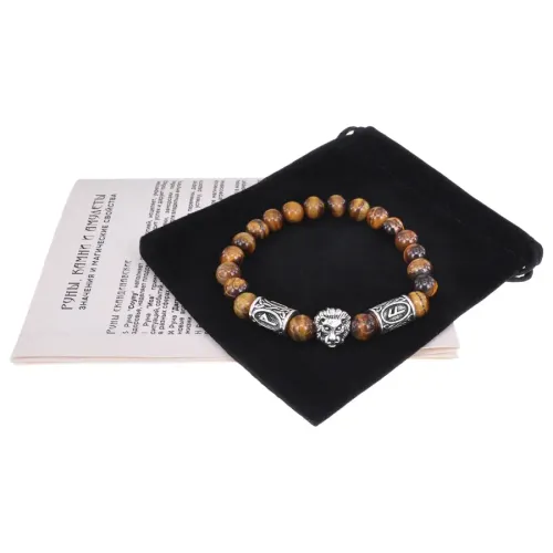 Рунический стрейч-браслет из натурального камня тигровый глаз с амулетом в виде льва.