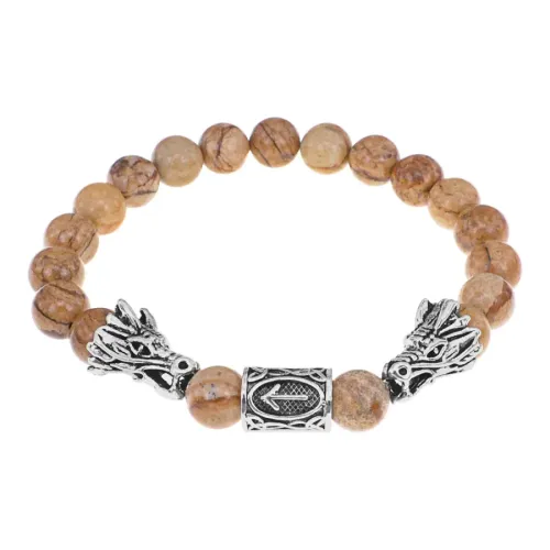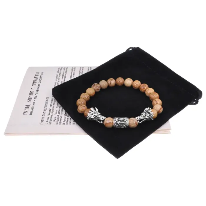 Рунический стрейч-браслет из натуральной песочной яшмы с амулетом в виде дракона и руной Тейваз.