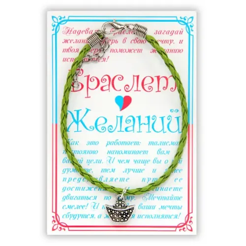 Браслет желаний На благополучие (Слиток) в салатовом цвете — это не просто украшение, а обережный талисман, который помогает привлекать положительную энергию и удачу. Цветные браслеты и подвески имеют свои значения, которые можно узнать из специального вкладыша. Браслет аккуратно упакован в прозрачный пластиковый пакет с европодвесом, что делает его отличным подарком для близких или символичным сувениром для себя. Этот аксессуар станет ярким акцентом любого образа и напоминанием о важности позитивного мышления.