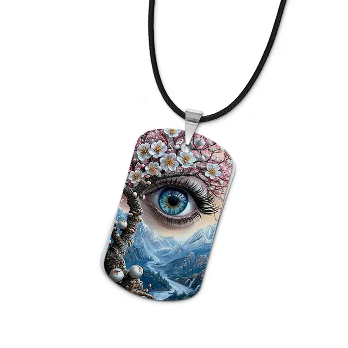 Кулон-жетон с изображением сакуры и глаза. Изготовлен из алюминиевого сплава, имеет двухсторонний цветной дизайн.
