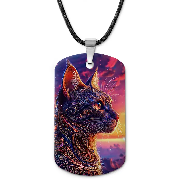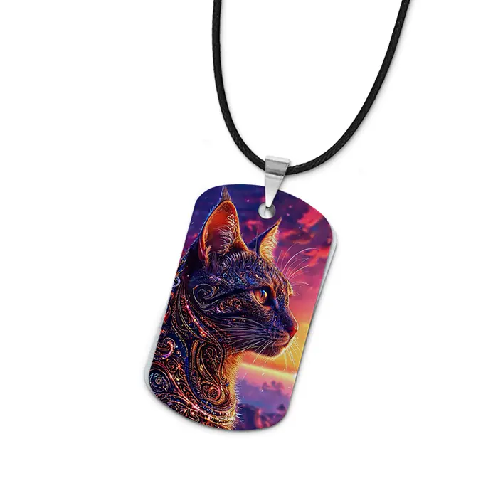 Кулон-жетон с двухсторонним цветным изображением кошки в сюрреалистичном стиле.