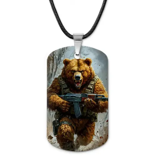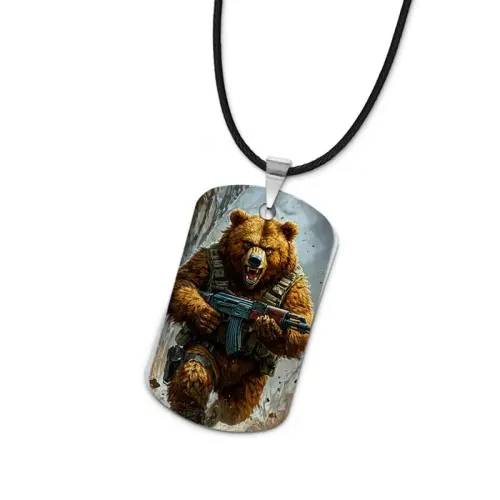 Кулон-жетон из алюминиевого сплава с изображением медведя и автомата.