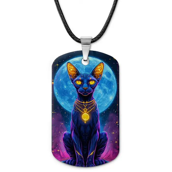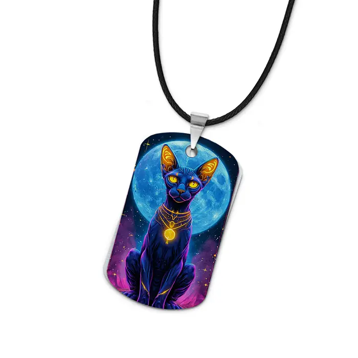 Двухсторонний кулон-жетон с изображением кота сфинкса, выполненный из алюминиевого сплава.