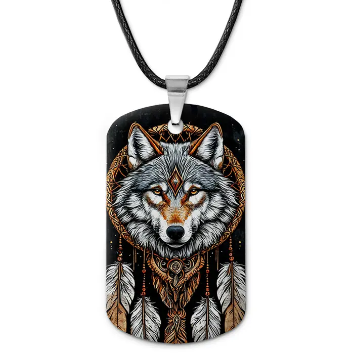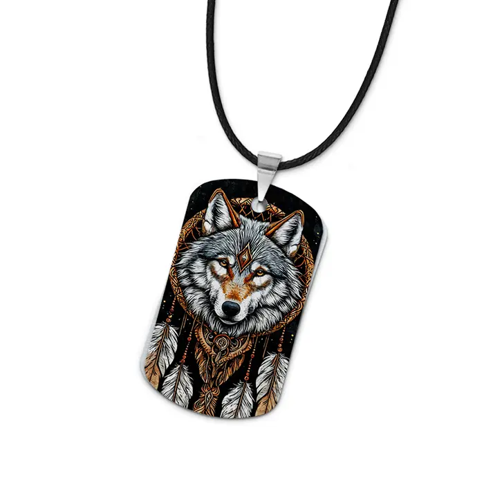 Кулон-жетон «Волк ловец снов» — двухсторонний аксессуар из алюминиевого сплава с цветным изображением.