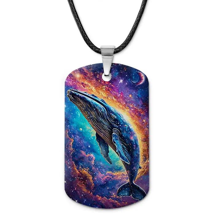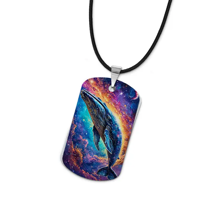 Двухсторонний кулон-жетон с цветным изображением кита и космоса. Изготовлен из алюминиевого сплава.