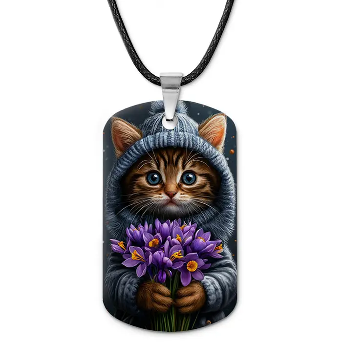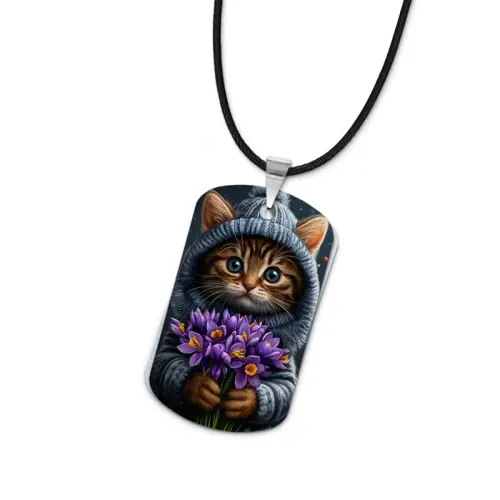 Двухсторонний кулон-жетон с изображением котёнка с букетом.