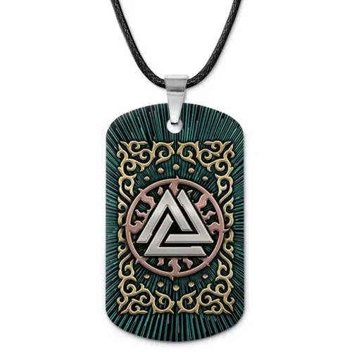 Двухсторонний кулон-жетон из алюминиевого сплава с цветным изображением символа Валькнут.