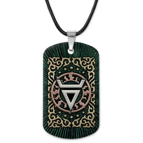 Двухсторонний кулон-жетон с цветным изображением символа Велеса, выполненный из алюминиевого сплава.