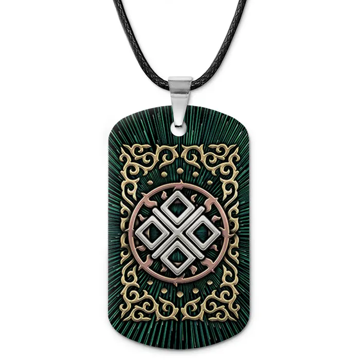 Двухсторонний кулон-жетон из алюминиевого сплава с изображением символа богини Макошь.