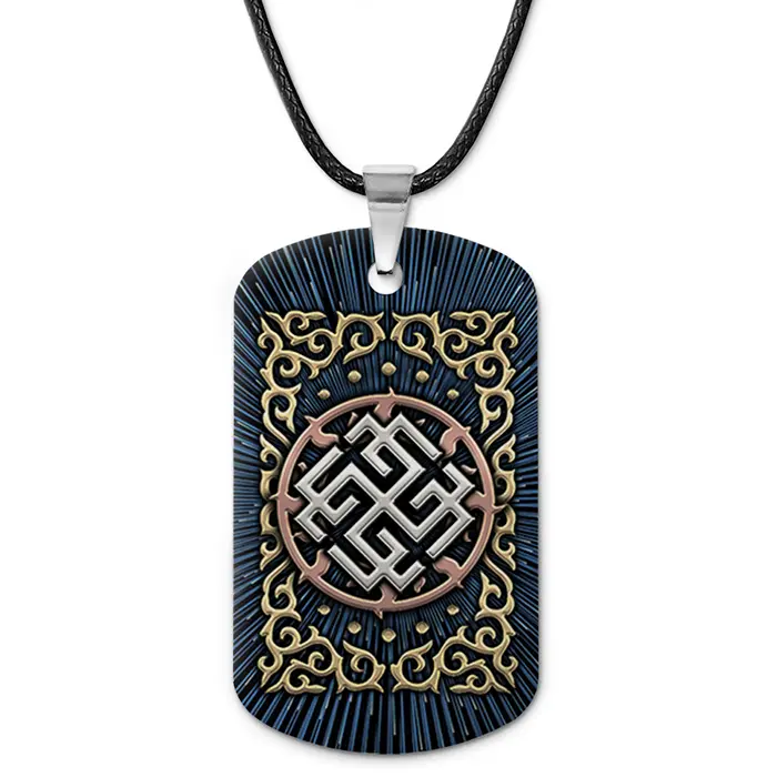 Двухсторонний кулон-жетон из алюминиевого сплава с цветным изображением символа Сварожич.