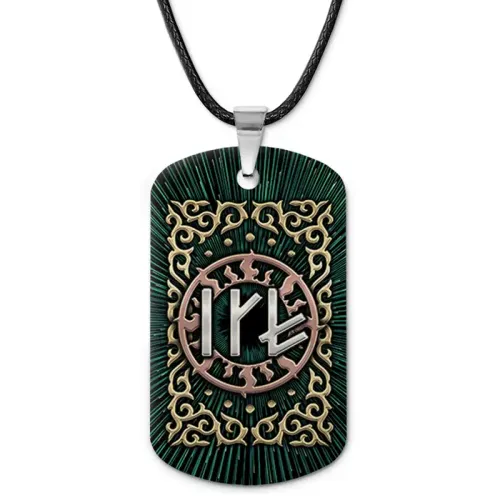 Двухсторонний кулон-жетон из алюминиевого сплава с цветным изображением славянской рунической формулы.
