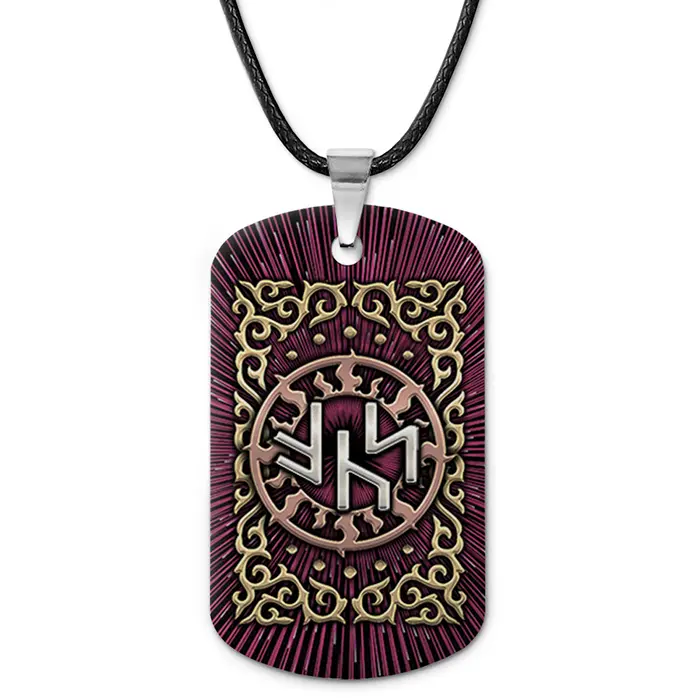 Сувенирный кулон-жетон из алюминиевого сплава с двусторонним цветным изображением славянской рунической формулы.