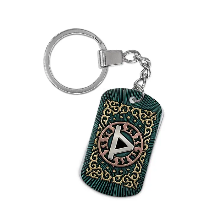 Брелок-жетон с изображением руны Даждьбог, выполненный из алюминиевого сплава с двусторонней цветной печатью.